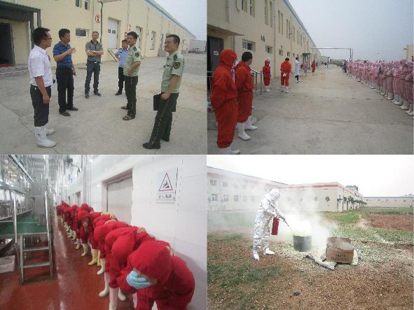 吉林德惠寶源豐禽業(yè)發(fā)生特大事故,造成120人遇難,在全國安全月伊始之時發(fā)生如此重大事故,教訓慘痛。為吸取這一慘痛的經(jīng)驗教訓,落實于董事長關(guān)于安全整頓的要求,進一步增強員工安全意識和自我救助能力,公司于2013年6月7日在各分廠車間、制冷機房和廠區(qū)空地三處演習地點舉行了緊急疏散、液氨泄漏緊急處置和消防滅火的實戰(zhàn)演練。